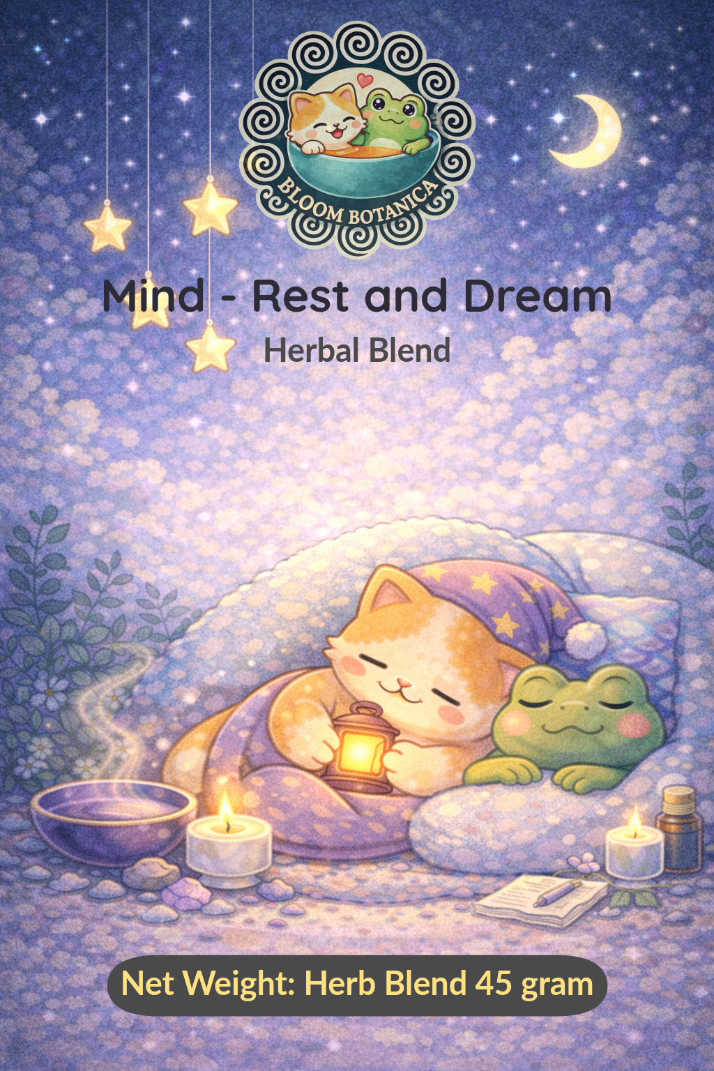 Thoughtfully composed for evening rituals and quiet reflection, Mind – Rest & Dream is designed for external use only as part of a warm bath or steam experience. When placed in water, the botanicals gently release their natural aromatics into a mineral-balanced soak, creating a soft, comforting atmosphere that invites stillness, unwinding, and a sense of ease.